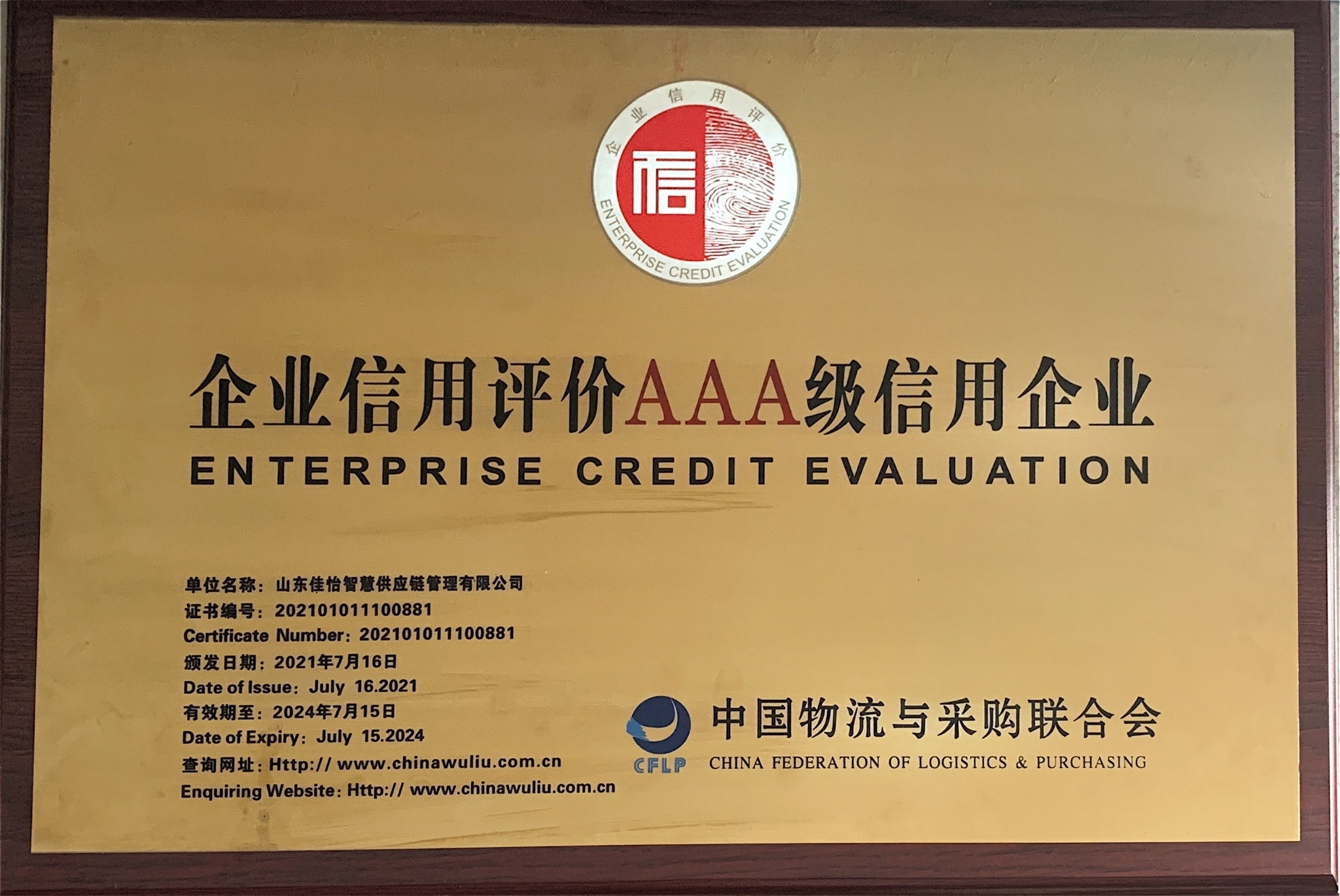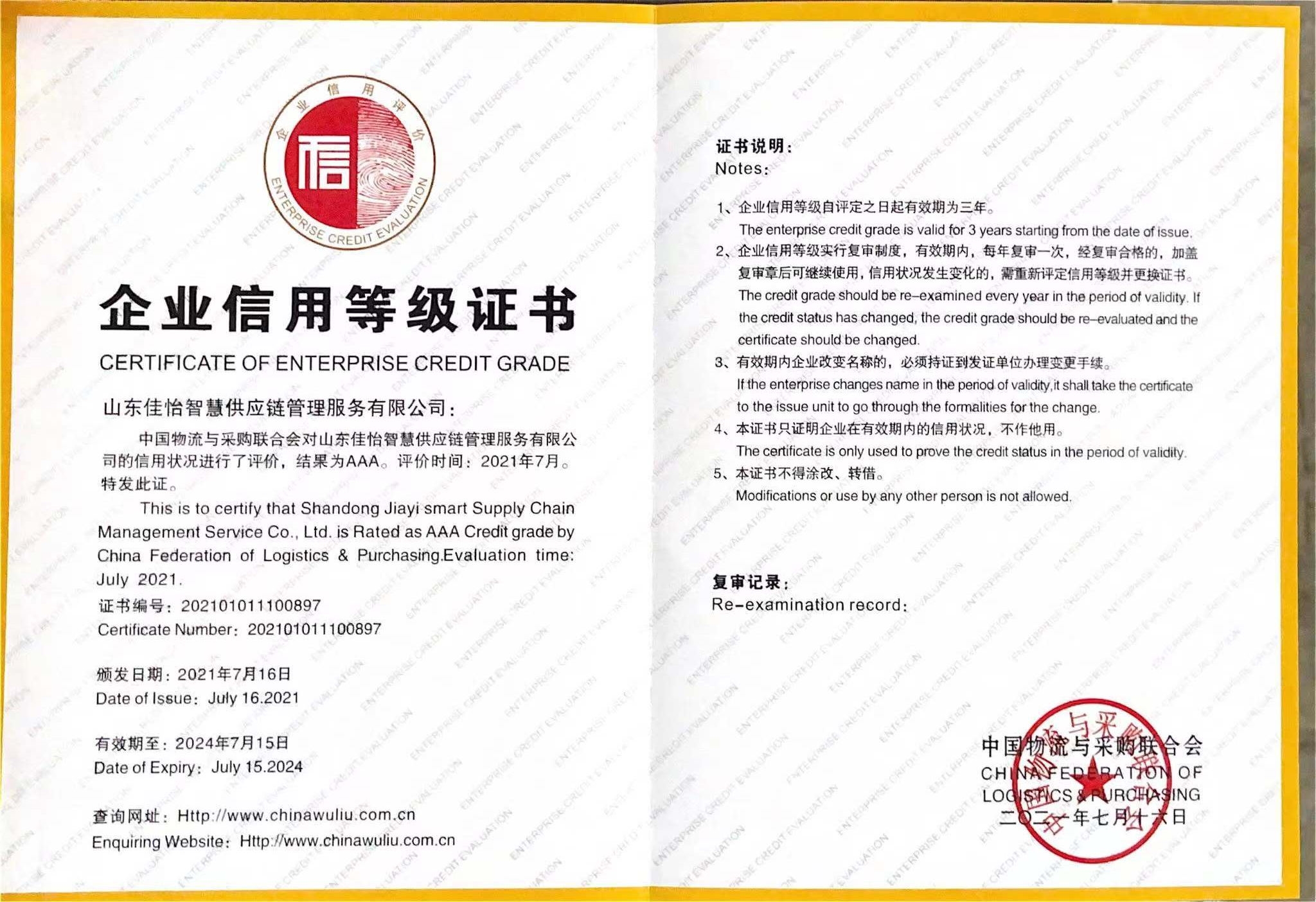 近日,中国物流与采购联合会公示了第二十八批物流企业信用评价A级信用企业名单,共评出A级信用企业77家,其中AAA级信用企业49家、AA级信用企业23家、A级信用企业5家,佳怡旗下山东佳怡智慧供应链管理有限公司与山东佳怡智慧供应链管理服务有限公司通过中物联认定,获信用评级中最高等级3A级信用企业。