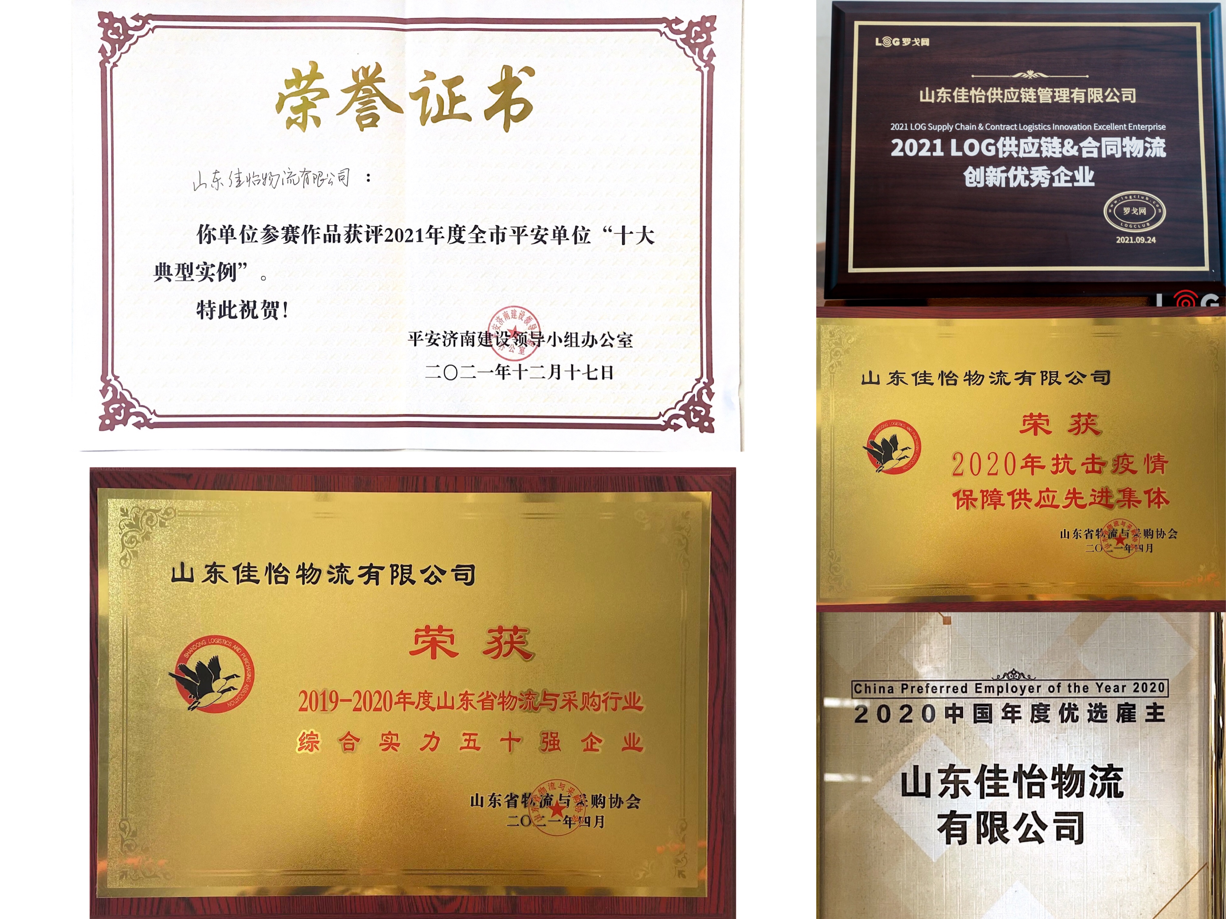 2021年,铸就“佳产品、佳服务”的品牌形象。佳怡的产品和服务获得社会各界以及客户的广泛认可,形成了独特的品牌价值链。今年,集团获得国家和省市各级荣誉20余项,其中包含山东省五一劳动奖、2020企业社会责任行业典范奖、山东省第一批全省供应链创新与应用示范企业、2019-2020年度山东省物流与采购行业综合实力50强企业、工业互联网优秀案例、2020中国年度优选雇主、2020抗击疫情保障供应链先进集体等。