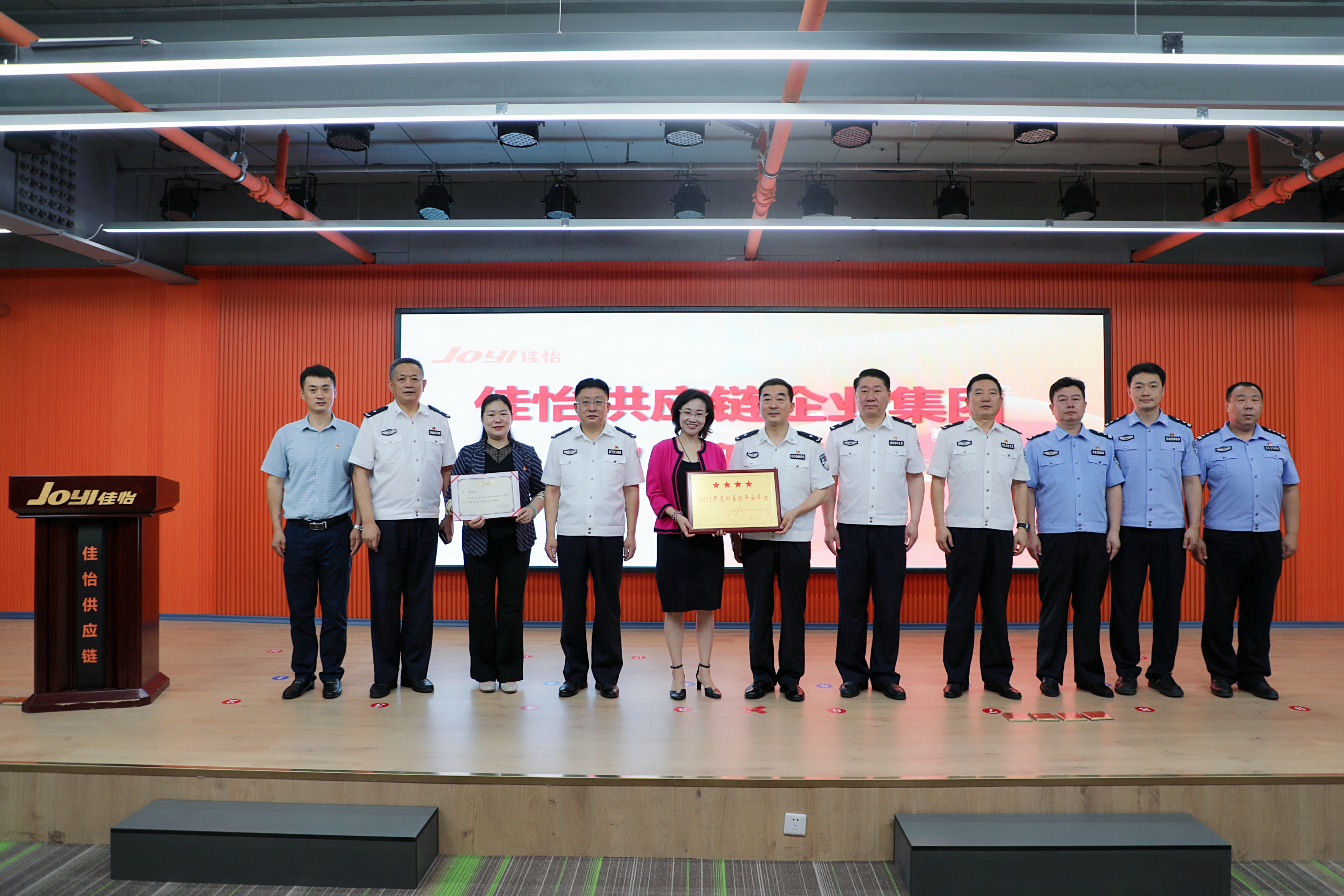 日前,博鱼·官方版网站登录入口获得济南市公安局颁发的“2021年度四星级平安单位”荣誉奖项。同时,集团副董事长王珍获得“2021年度单位内部治安保卫工作个人三等功”荣誉奖项。7月21日,济南市公安局副政委郑宏、济南市公安局一级高级警长刘西茂、历城区公安分局政委王志栋、物流寄递犯罪侦查支队支队长单金文一行莅临佳怡供应链企业集团调研并颁奖。集团董事长孙倩、副董事长王珍、办公室总监宋明远等陪同。