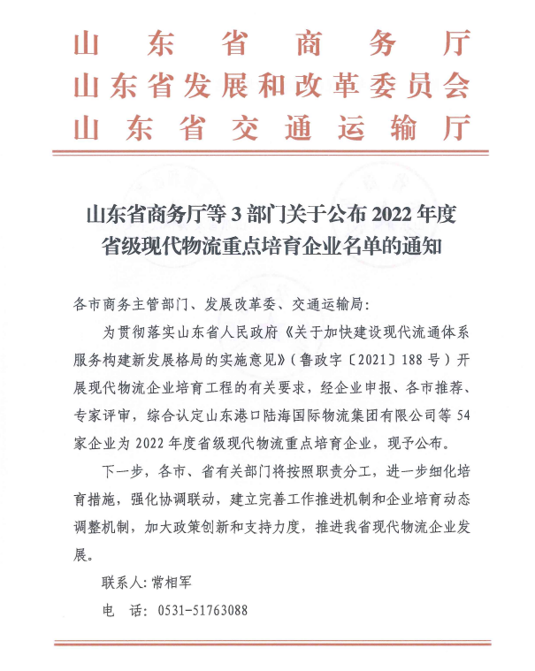 近日,山东省商务厅、山东省发展和改革委员会、山东省交通运输厅联合公布了2022年度省级现代物流重点培育企业名单。山东佳怡供应链管理有限公司成为上榜的54家企业之一。