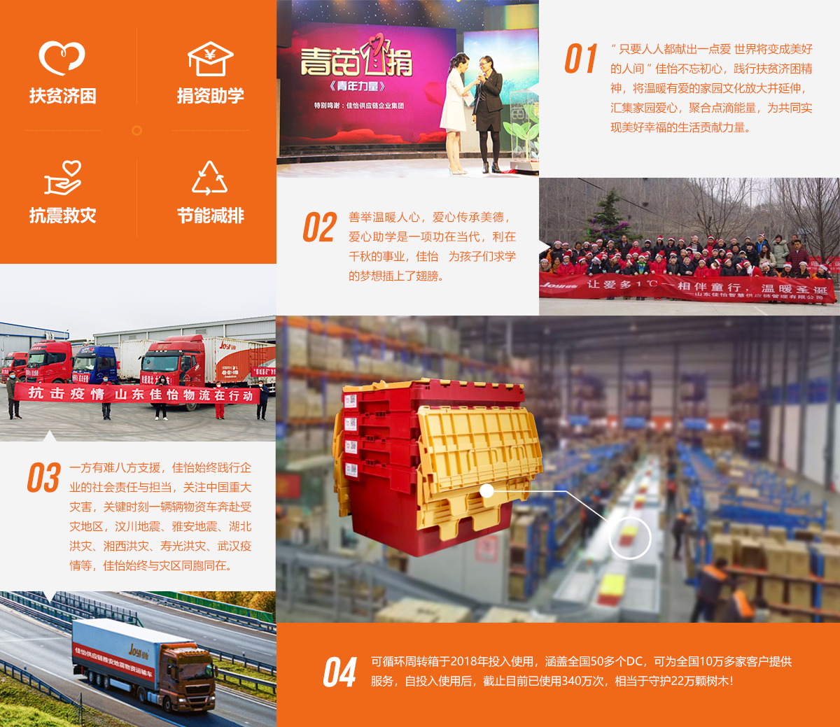 佳怡供应链企业集团在追求可持续发展、绿色发展、循环发展中,为员工成长搭建舞台,热心公益慈善事业、积极回馈社会,弘扬社会正能量,彰显企业社会价值。